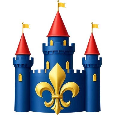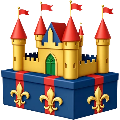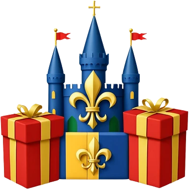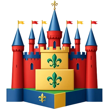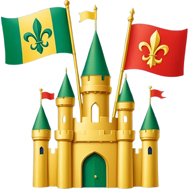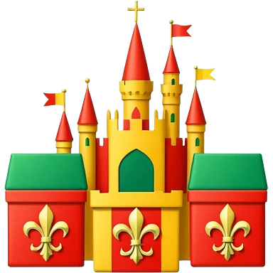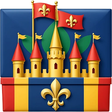 flag with 4 boxes: gold fleur-de-lis on deep blue/black; green, yellow, red stripes in upper right and lower left with green star in upper right; yellow castle on red in lower right. Flat vector, clean, high contrast, clear at small size. emoji