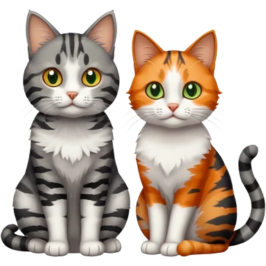 A grey tabby cat with dark grey stripes and green eyes sitting next to a calico cat with orange eyes emoji