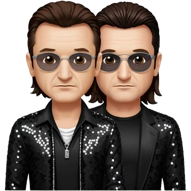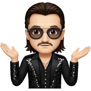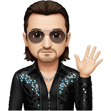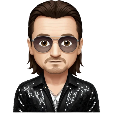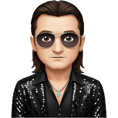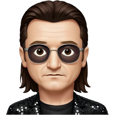 Bono from U2 with long dark brown hair, black sequin outfit emoji