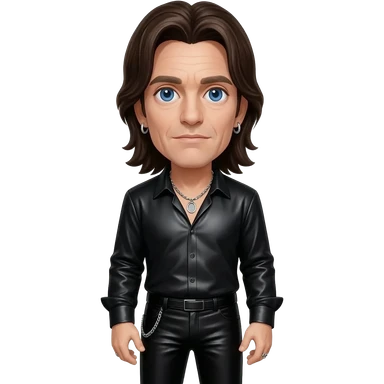 Bono with blue eyes, long dark brown hair, black metallic shirt, black metallic baggy pants, silver necklace emoji