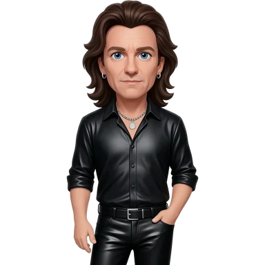 Bono from U2 with blue eyes, long dark brown hair, black metallic shirt, black metallic dress pants, silver necklace and short earrings emoji