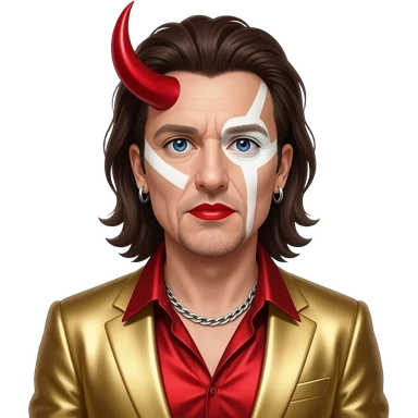 Bono with blue eyes, long dark brown hair, red metallic dress shirt, gold metallic suit jacket, silver necklace and short earrings, red devil horn, white face paint, red lipstick emoji