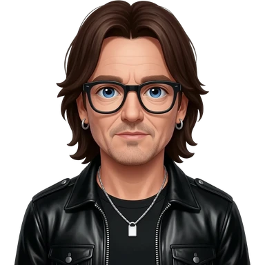Bono with blue eyes, long dark brown hair, black shirt, black vinyl jacket, black glasses, silver necklace and short earrings emoji