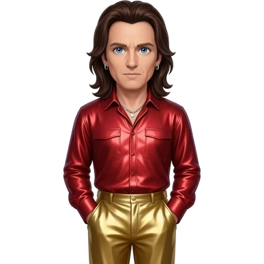 Bono from U2 with blue eyes, long dark brown hair, red metallic shirt, gold metallic baggy dress pants, silver necklace and short earrings emoji