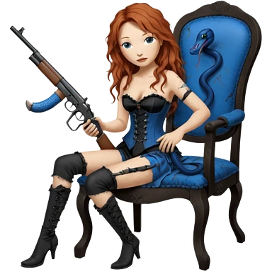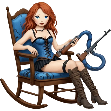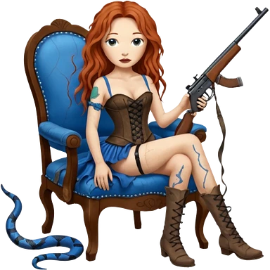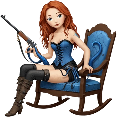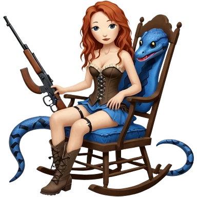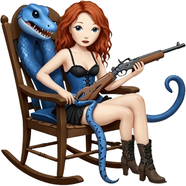 realistic cinematic Tori Amos sits on a rocking chair in a torn corset, holding an antique rifle and her bare feet are muddy. A blue snake is wrapped around the chair. emoji