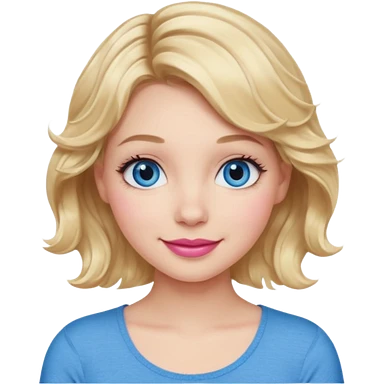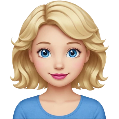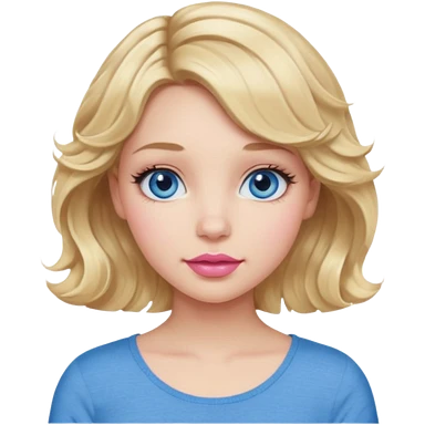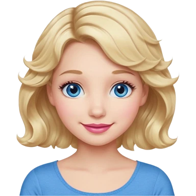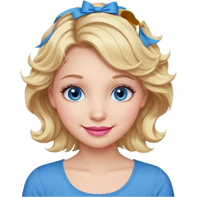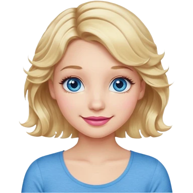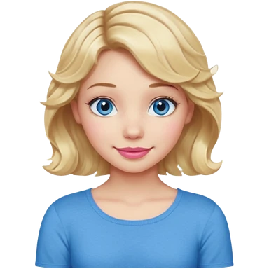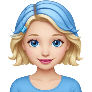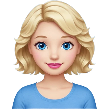 Girl Blonde short wavy hair, blue eyes, cute blue top, long lashes, pink lips, 👄 emoji