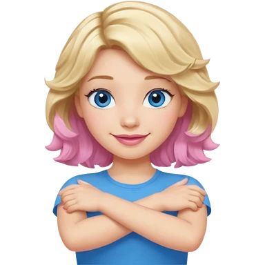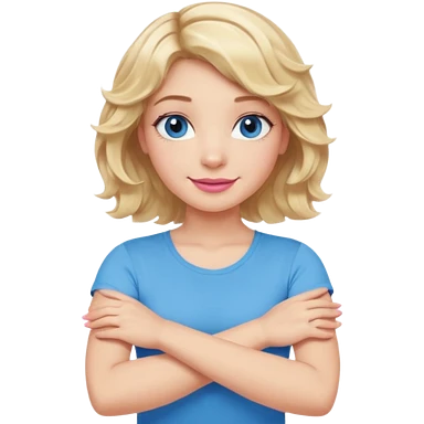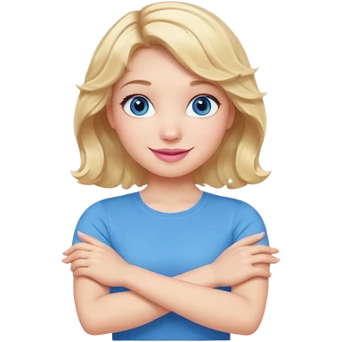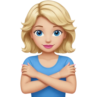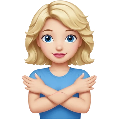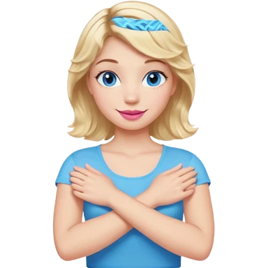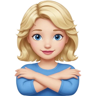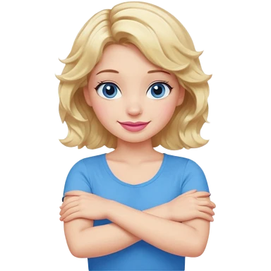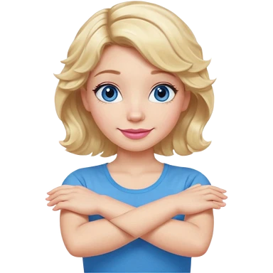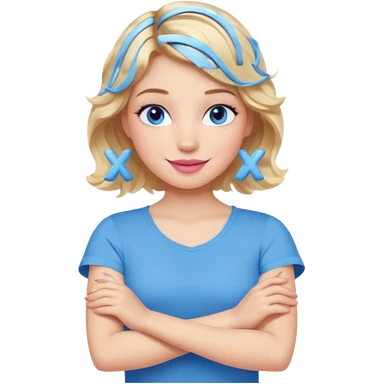 Girl Blonde short wavy hair, blue eyes, cute blue top, long lashes, pink lips, smiling, making cross arms with arms emoji