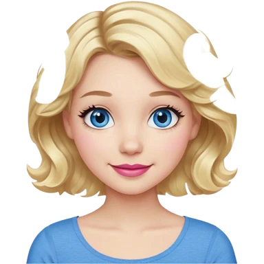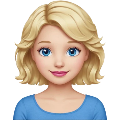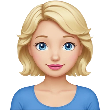 Girl Blonde short wavy hair, blue eyes, cute blue top, long lashes, pink lips, smiling, 🤦🏻♀️ emoji