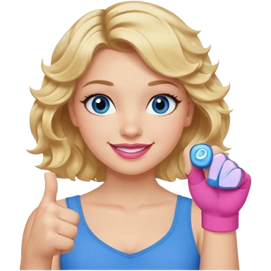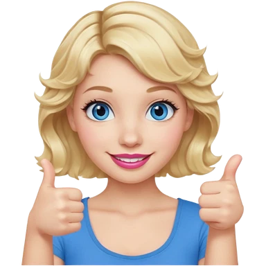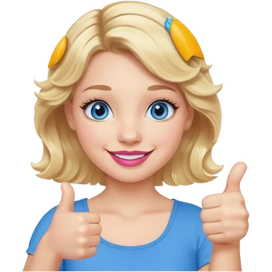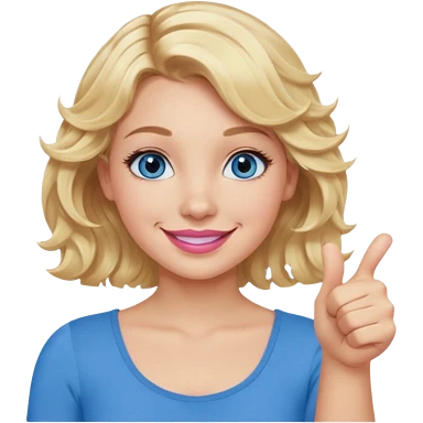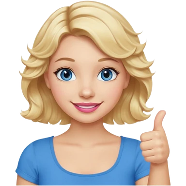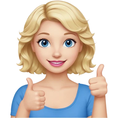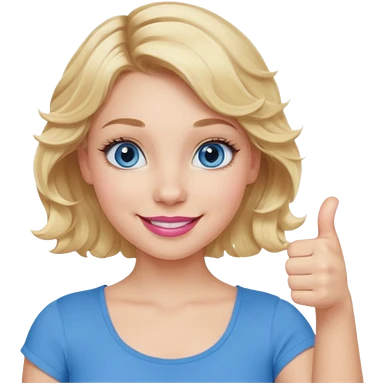 Girl Blonde short wavy hair, blue eyes, cute blue top, long lashes, pink lips, smiling, thumbs up emoji