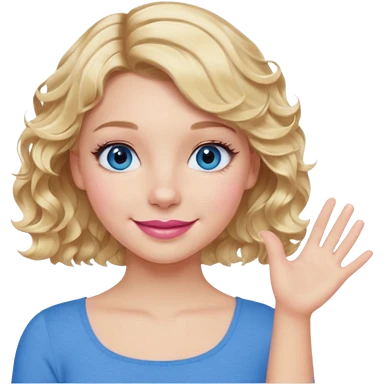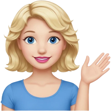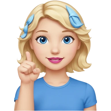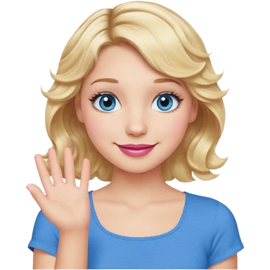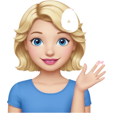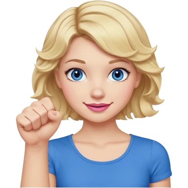 Girl Blonde short wavy hair, blue eyes, cute blue top, long lashes, pink lips, smiling, fist bump emoji