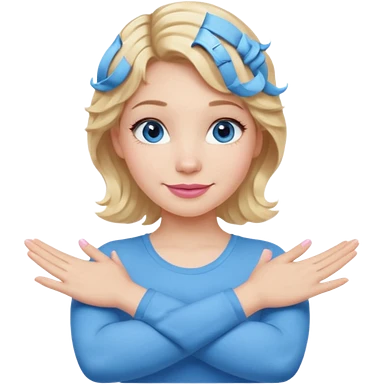 Girl Blonde short wavy hair, blue eyes, cute blue top, long lashes, pink lips, smiling, making cross arms X with arms emoji