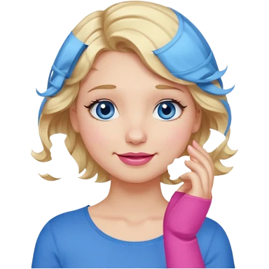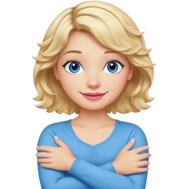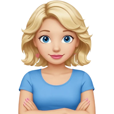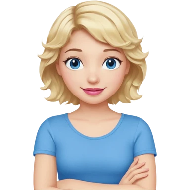 Girl Blonde short wavy hair, blue eyes, cute blue top, long lashes, pink lips, smiling, cross arms emoji