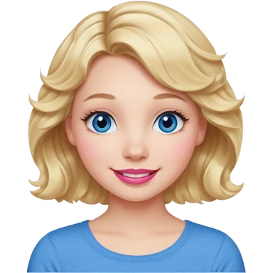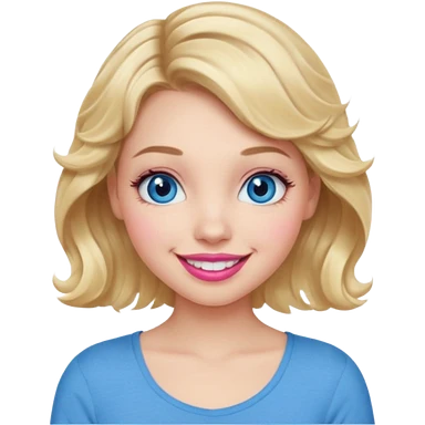 Girl Blonde short wavy hair, blue eyes, cute blue top, long lashes, pink lips, 👄 big smile emoji