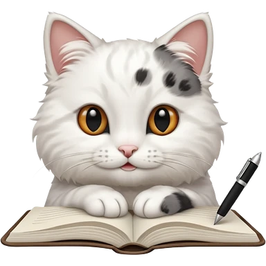 gatita blanca con manchas negras en los ojos feliz en viendo una libreta anillada emoji