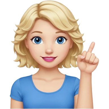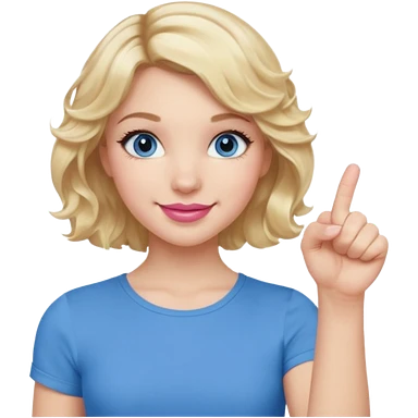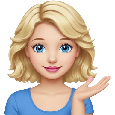 Girl Blonde short wavy hair, blue eyes, cute blue top, long lashes, pink lips, smiling, one hand 🤷🏼♀️ emoji