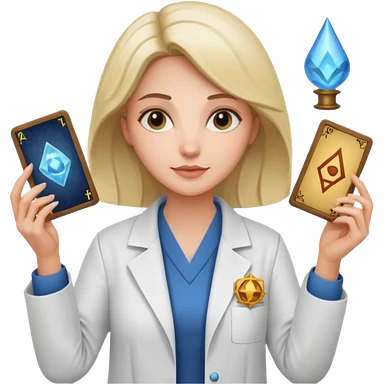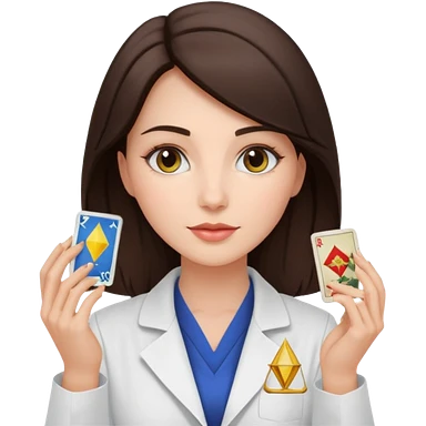 Beautiful scientist brunette woman in a a lab coat with tarot cards emoji