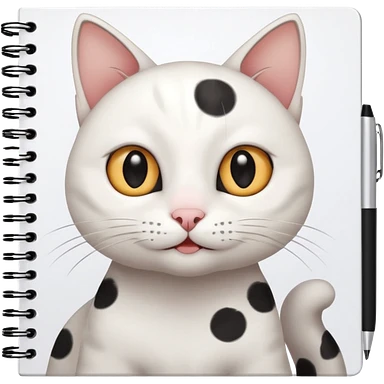gatita blanca con manchas grandes negras en los ojos feliz en viendo una libreta con anillado emoji