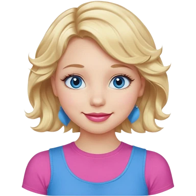 Girl Blonde short wavy hair, blue eyes, cute blue top, long lashes, pink lips, smiling, 💁🏻♀️ emoji
