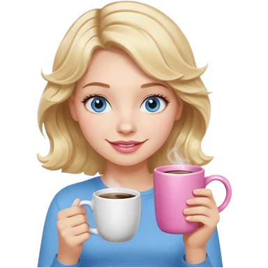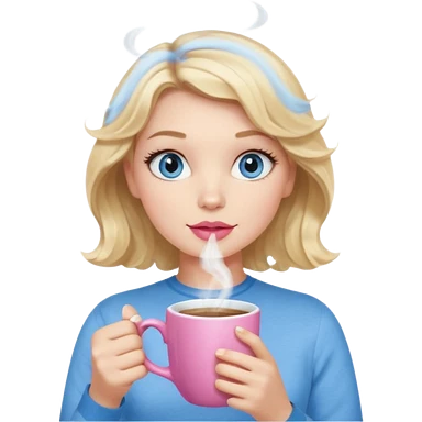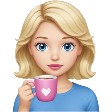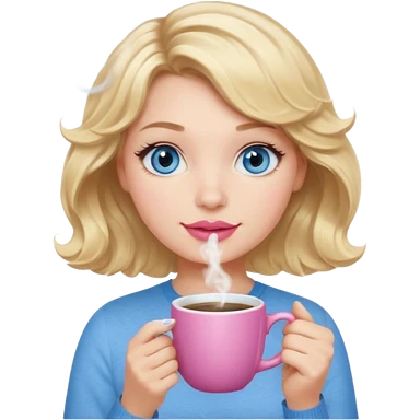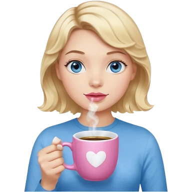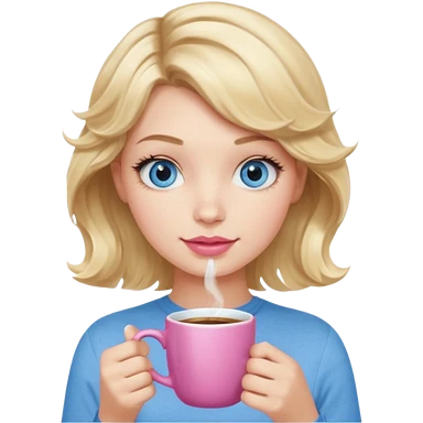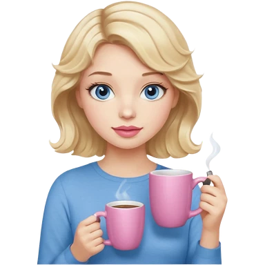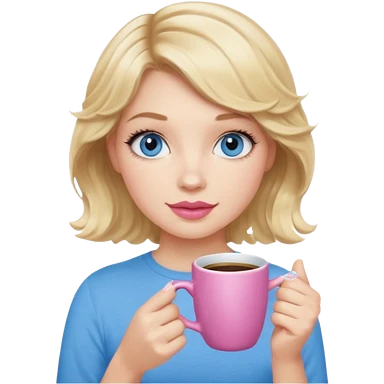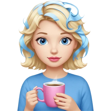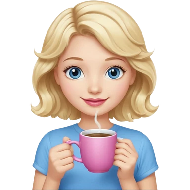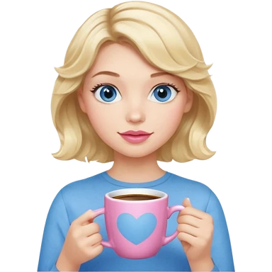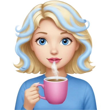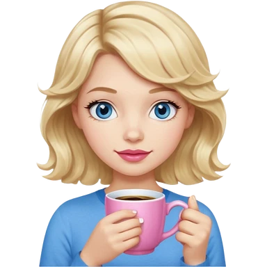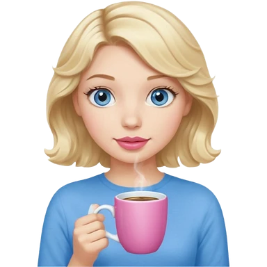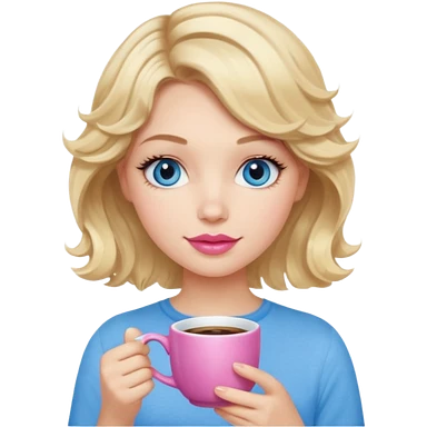 Girl Blonde short wavy hair, blue eyes, cute blue top, long lashes, pink lips, holding hot white coffee mug emoji