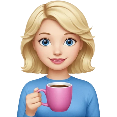Girl Blonde short wavy hair, blue eyes, cute blue top, long lashes, pink lips, holding coffee mug emoji