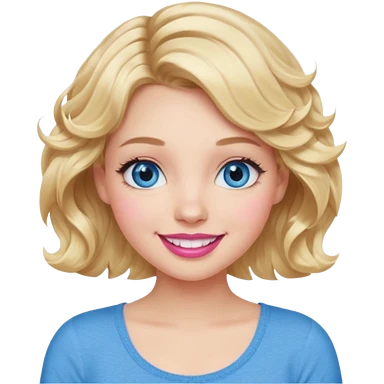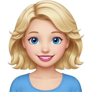 Girl Blonde short wavy hair, blue eyes, cute blue top, long lashes, pink lips, 👄 big smile emoji