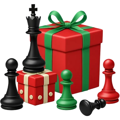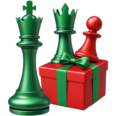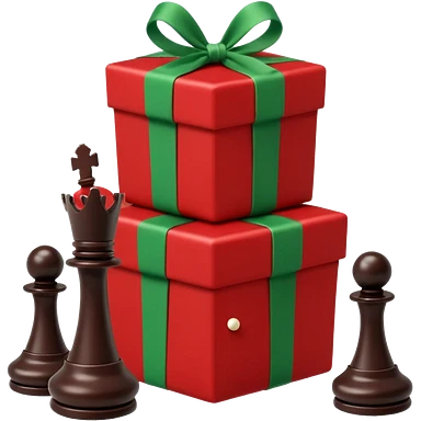 A red gift tied with a green ribbon in a white polka dot, with a knight and pawn chess pieces falling out of the gift emoji