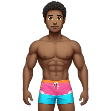 man with full athletic body in swim trunks, light skin and dark combed hair doing a pose emoji