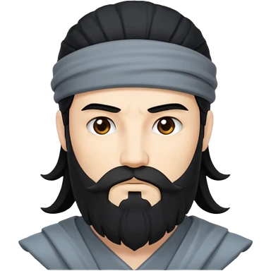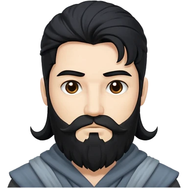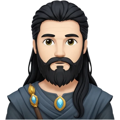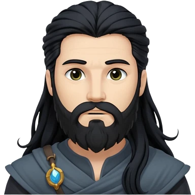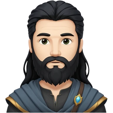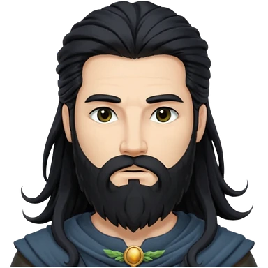 Boreas, God of North Wind from Gods and Goddesses with long black shaggy hair and beard, deep blue sequin outfit emoji | AI Emoji Generator