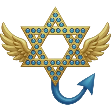 A gold six-pointed Star of David encrusted with royal blue stones with wings coming out of both sides and a blue devil tail coming out of the bottom emoji