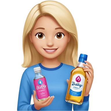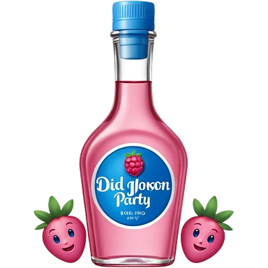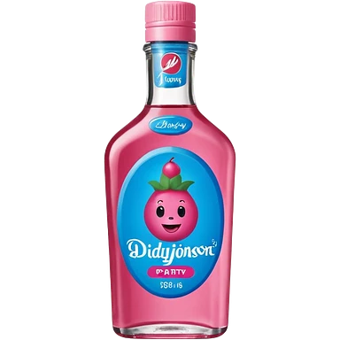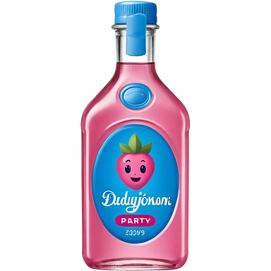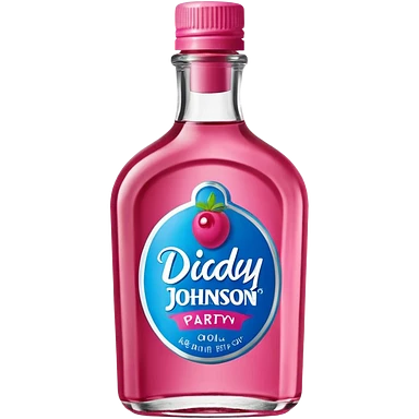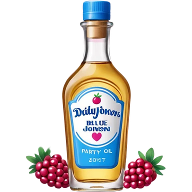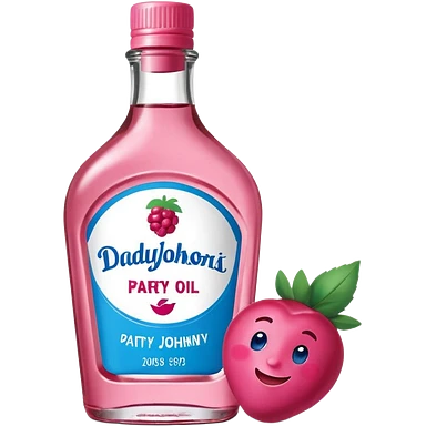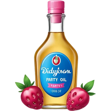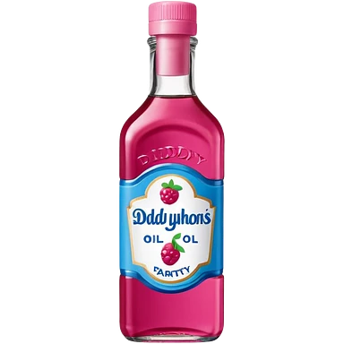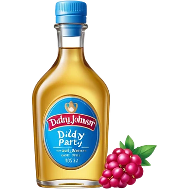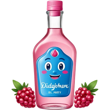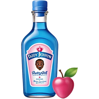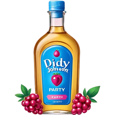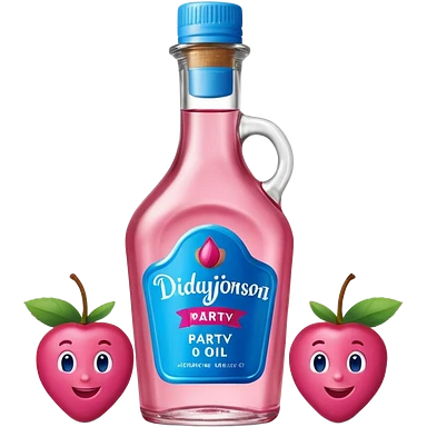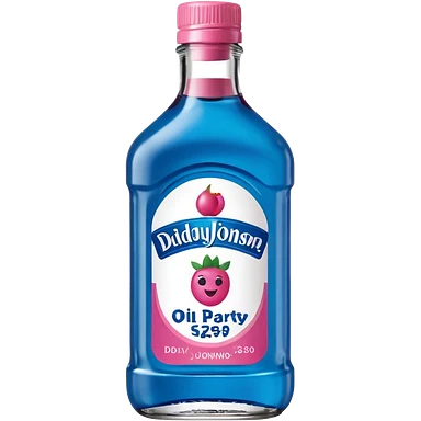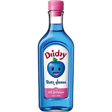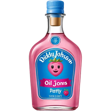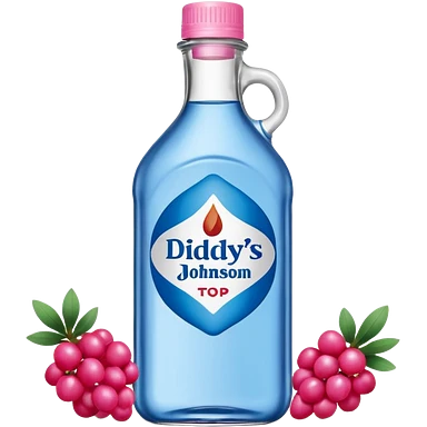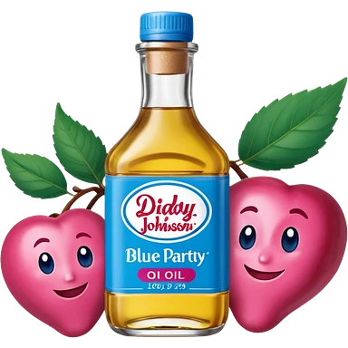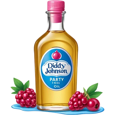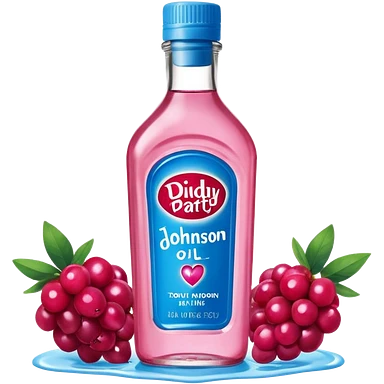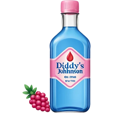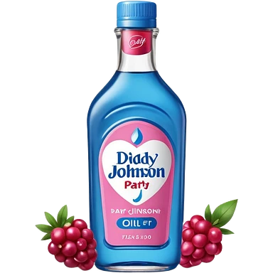 bottle of oil blue top pink outside with logo that says Diddys Oil Johnson and Johnson bottle with a berry on top emoji