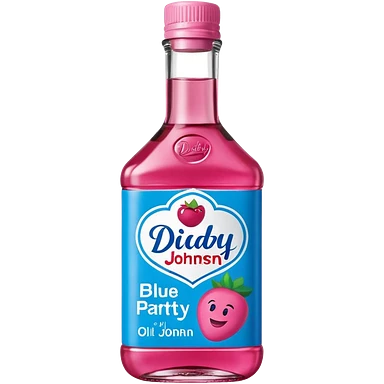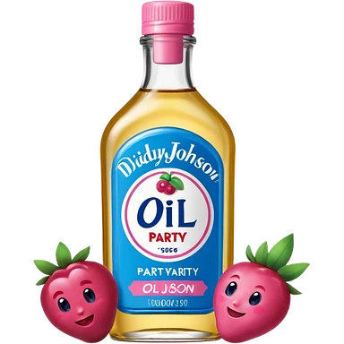 bottle of oil blue top pink outside with logo that says Diddy Party oil Johnson and Johnson brand with a smiling berry on top emoji