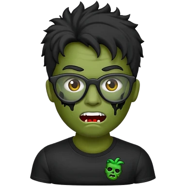 Crie um zumbi estilo emoji do iPhone com cabelo ondulado grande preto com camiseta preta e óculos de grau preto emoji
