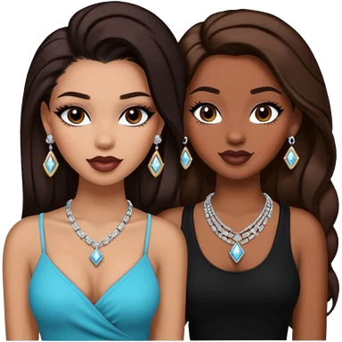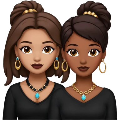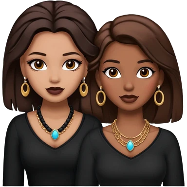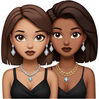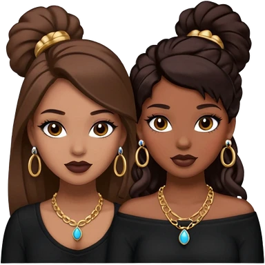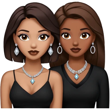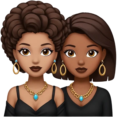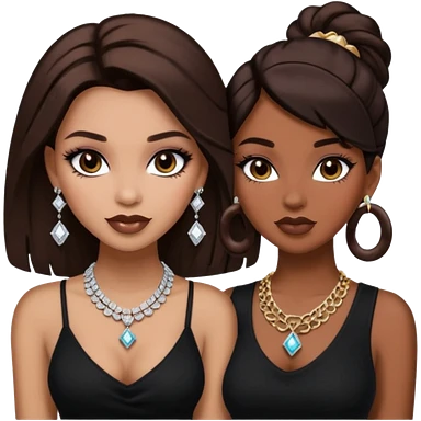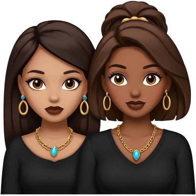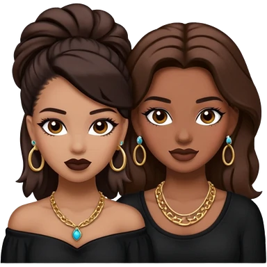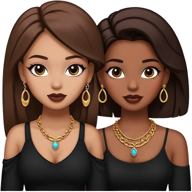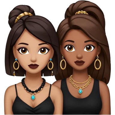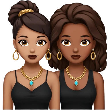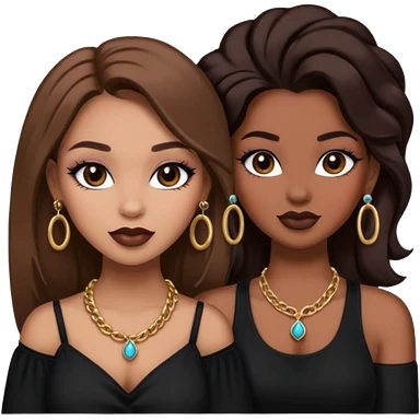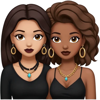 Boujy baddie best friends, trendy heavy makeup both dark hair one light skinned and one mocha brown pretty hair style both wearing black and earrings and necklace one mocha brown skin emoji