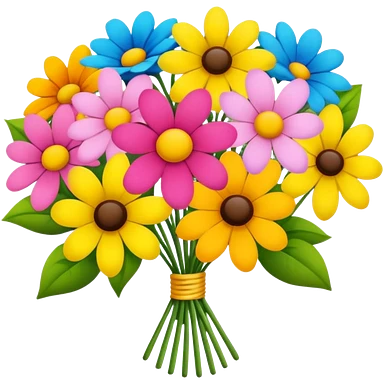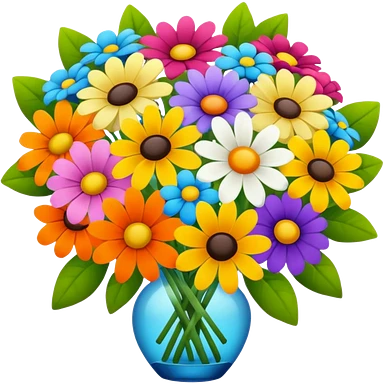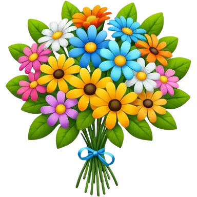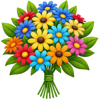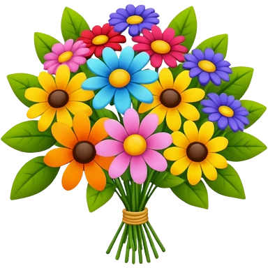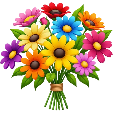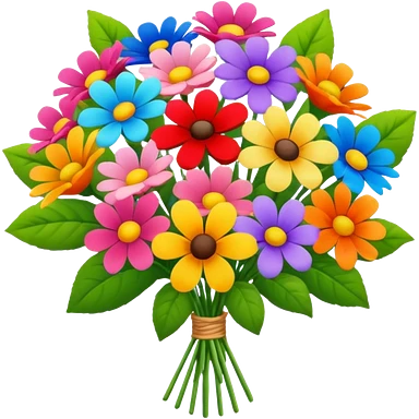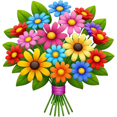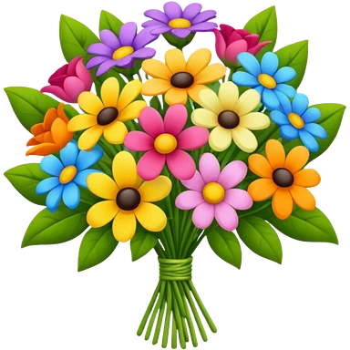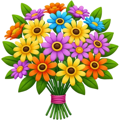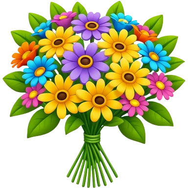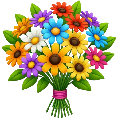 bouquet. resolution of 5000x5800 pixels. transparent background. design should emphasize clean, thin, smooth lines to enhance the visual appeal. Bouquet of lush mixed flowers should be depicted in purple, pink, orange iridescent, holographic, hues. Surround the flowers with realistic leaves, 8k emoji