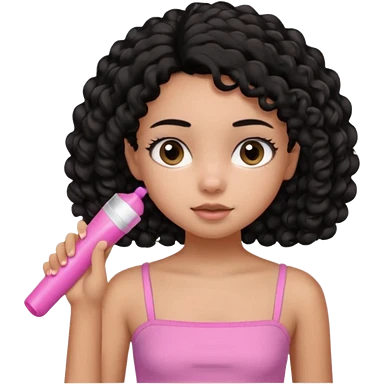 A black 12 yr old girl brushing her shoulder length hair, doe eyes, almond eyes pink tube top and black hair like the 3rd emoji