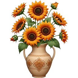 bouquet of bright orange sunflowers in a beige aesthetic vase in vintage style with beautiful ornaments of brown color emoji