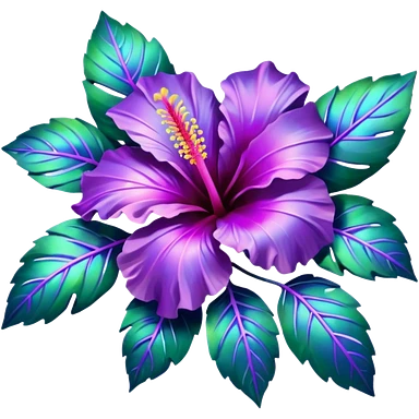 Lush Hibiscus bouquet. resolution of 5000x5800 pixels. transparent background. The design should emphasize clean, thin, and smooth lines to enhance the visual appeal. Hibiscus flowers should be depicted in purple iridescent, holographic, hues. Surround the flowers with realistic leaves, 8k emoji