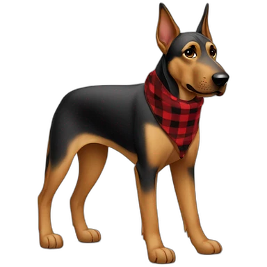 adult 75% Coonhound 25% German Shepherd mix dog with visible tail wearing small pointed red buffalo plaid bandana full body walking left quickly emoji