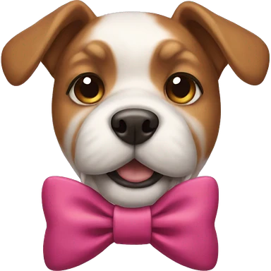 white boxer dog face with some black and pink features, with a pink bow on her head that has long ribbons emoji
