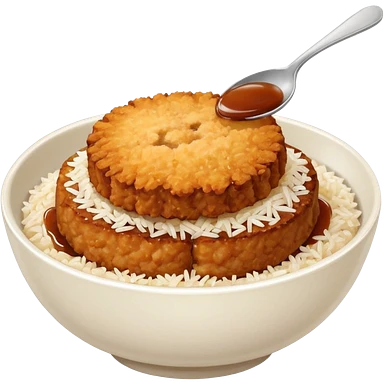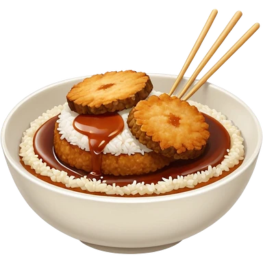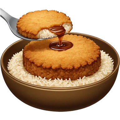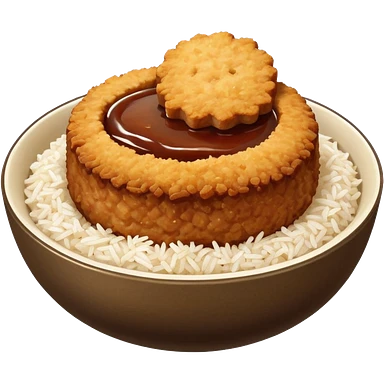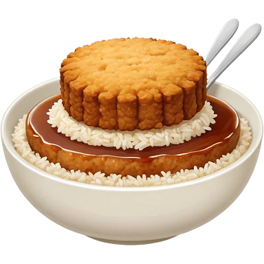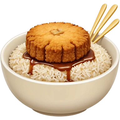 bowl filled with rice, a bit of brown sauce over the rice and a breaded pork cutlet over it. no cutlery or chopsticks anywhere emoji | AI Emoji Generator