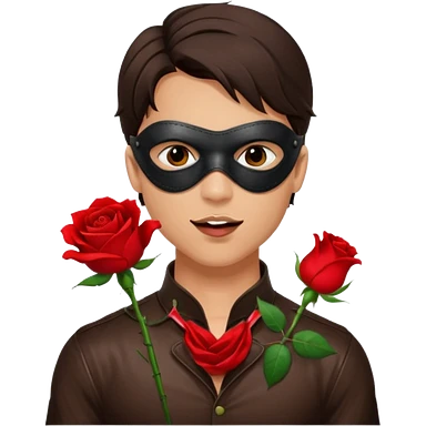 brunette young adult man with leather eye mask and leather halter neck blouse, holding rose with his mouth emoji