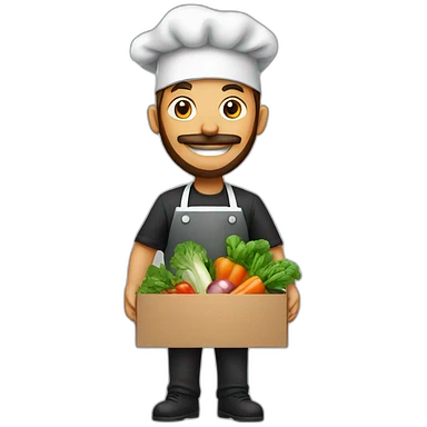 A CHEF WITH A SURPRISE BOX full of vegetables with no hat and a beard emoji