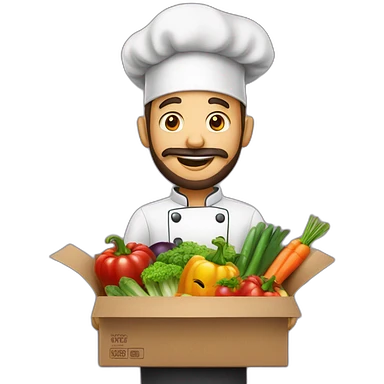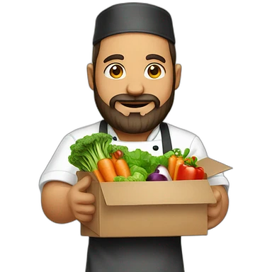 A CHEF WITH A SURPRISE BOX full of vegetables with no hat chef and a beard emoji