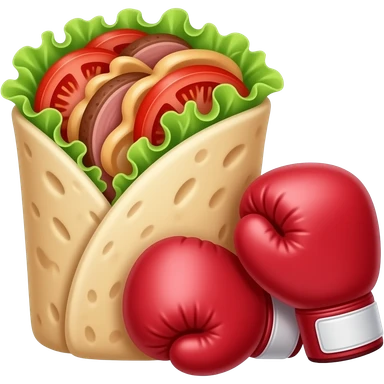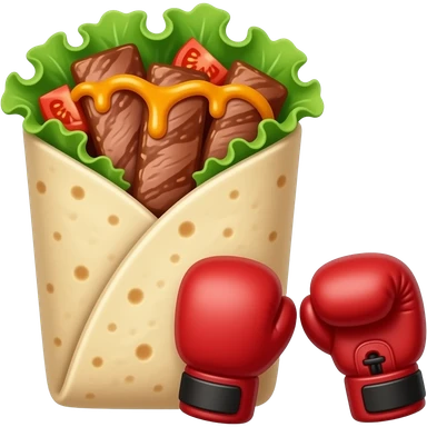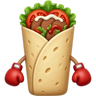 Doner kebab emoji, clearly visible layered kebab meat slices (not sausage), with salad, tomato and sauce, wrap visible, small boxing gloves, no arms or legs, cute competitive face, clean glossy emoji style emoji