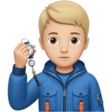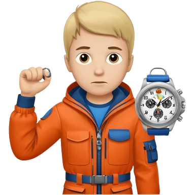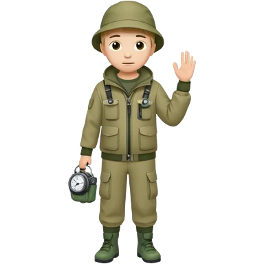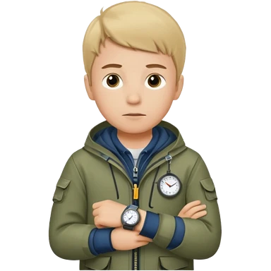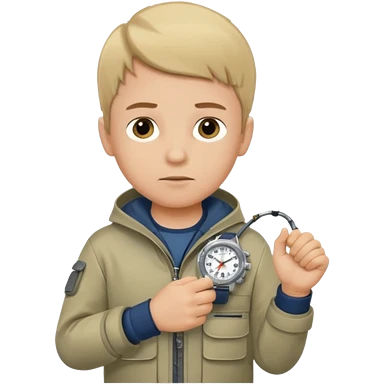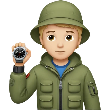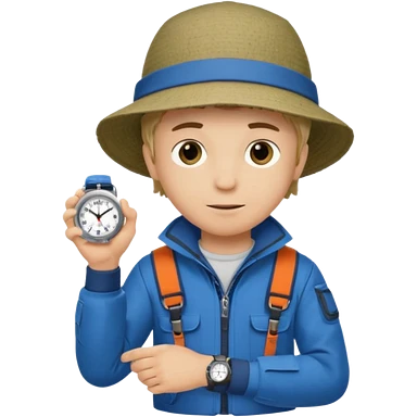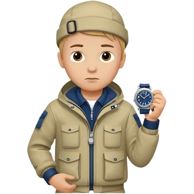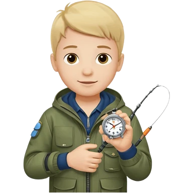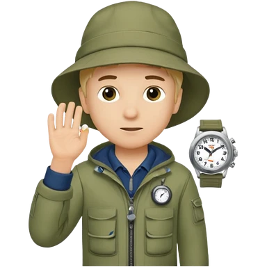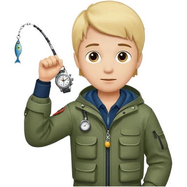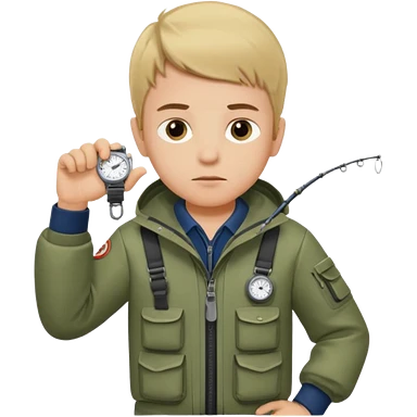 Boy in fishing suit looking at his wristwatch emoji