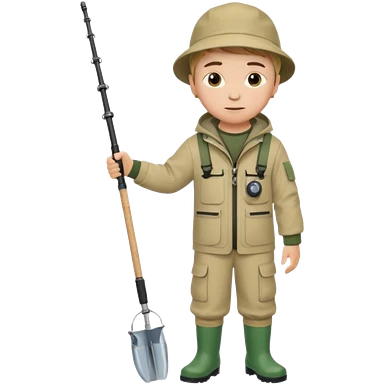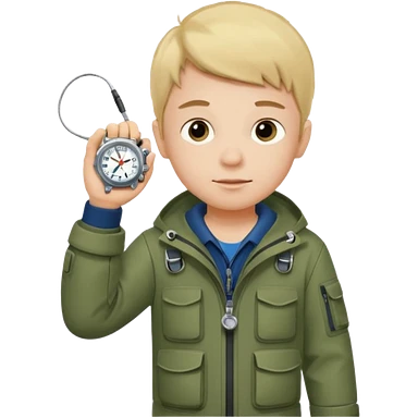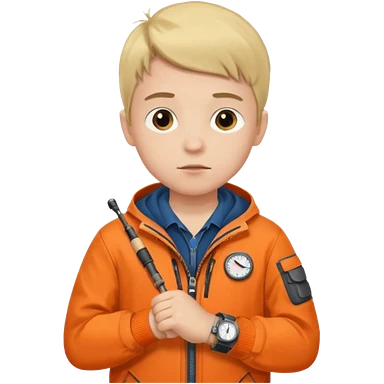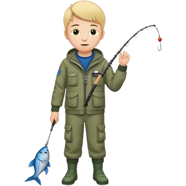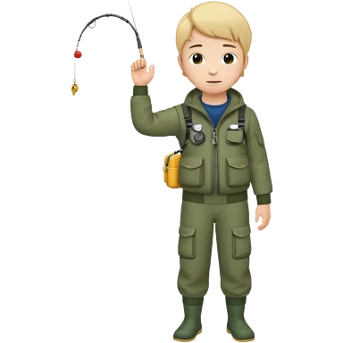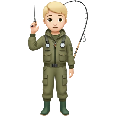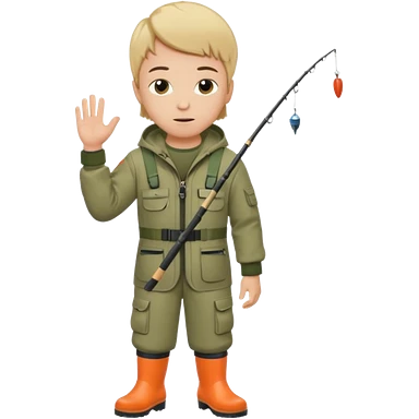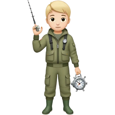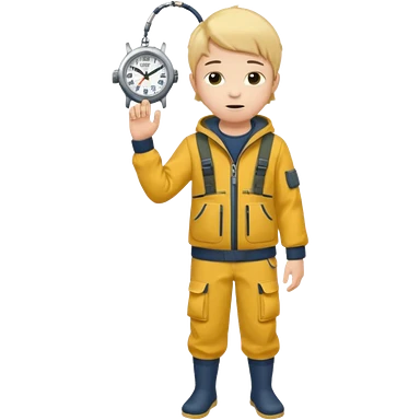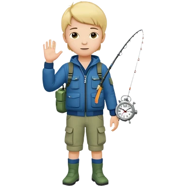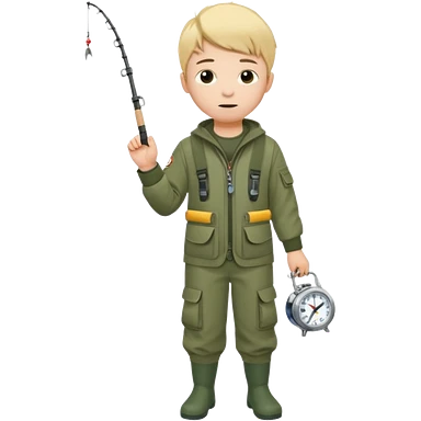 Boy in fishing suit looking at his wristwatch, full body emoji