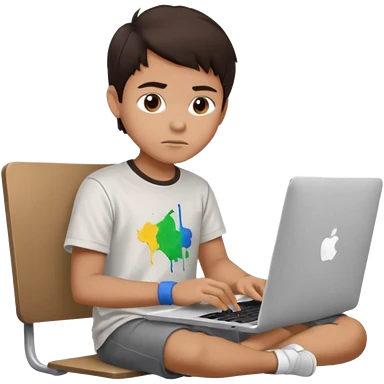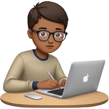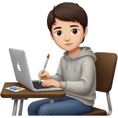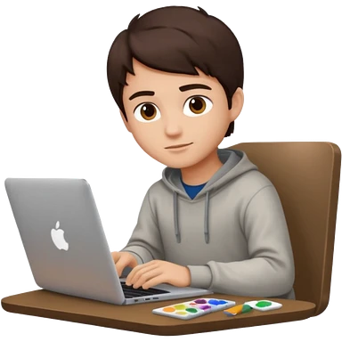 boy working in Macbook, he is graphic designer and paint artist, he seat front side and hair dark brown color emoji
