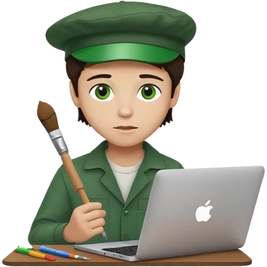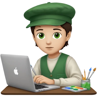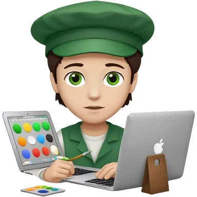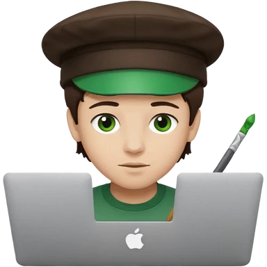 boy working in Macbook, him hat same like painter artist, eyes green color, color hair dark brown emoji