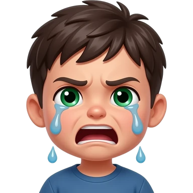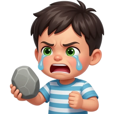 Little slim dark haïr boy with green eyes se sing big stones with very angry face, crying emoji