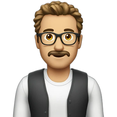 Cheveux bouclés, bruns foncés, longueur moyenne. Yeux marron vert. Visage ovale avec léger bouc. Expression légèrement sérieuse, sourcils froncés. T-shirt noir avec bandes blanches sur les épaules. Ajoute des AirPods. emoji